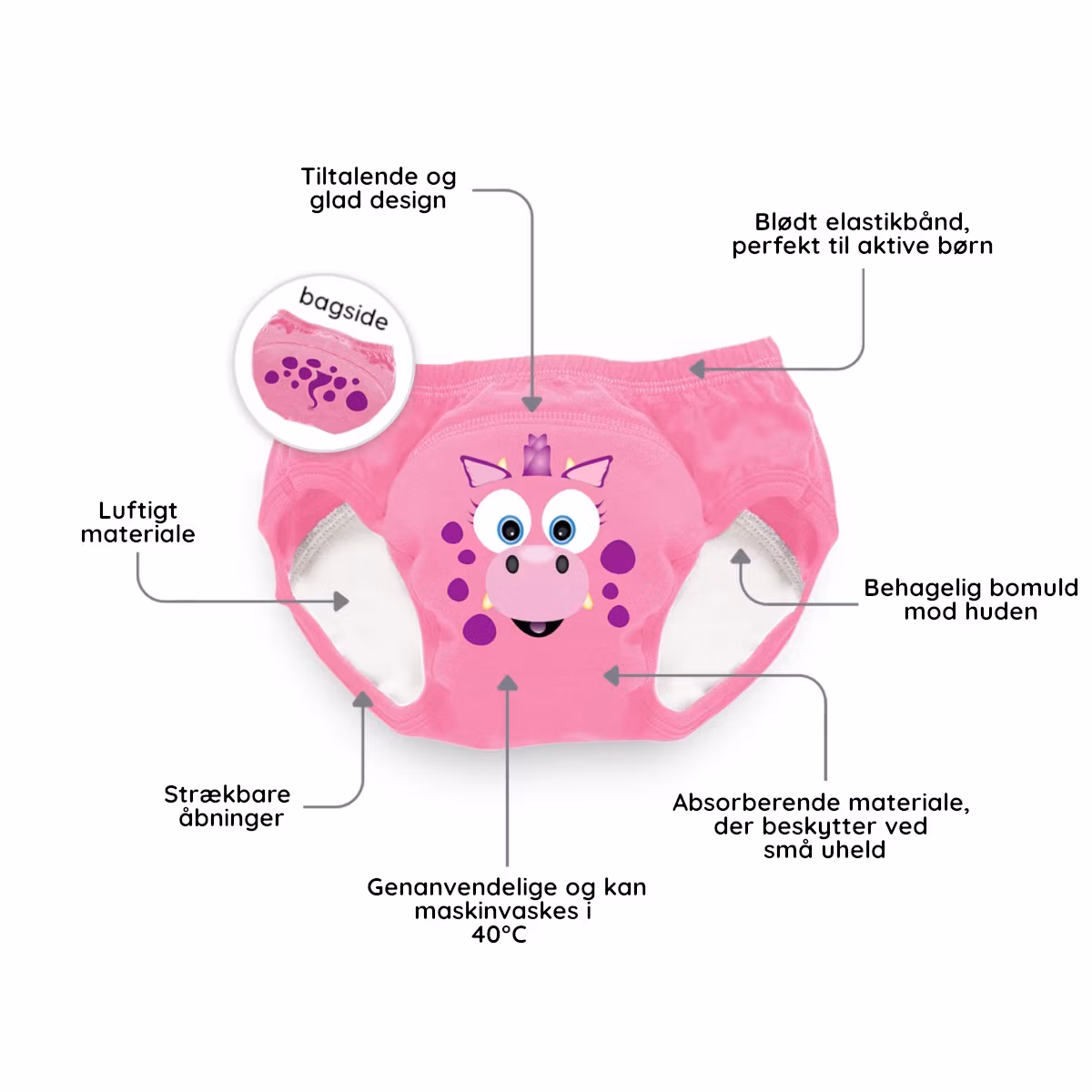 Barnet kan nemt medbringe sin egen potte, hvilket skaber tryghed og hjælper med at undgå ubehagelige situationer under pottetræning. Vores pottetræningsbukser er lavet af blødt bomuldsstof, der er behageligt mod barnets hud. Bukserne har også et vandafvisende lag, der beskytter mod små uheld.