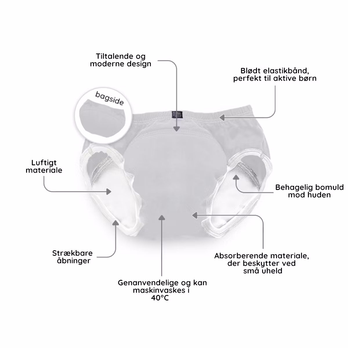 Komfortable og med en god pasform er de perfekte til at undgå bleer under pottetræning. Et praktisk elastikbånd gør det også nemt for barnet selv at øve sig i at trække bukserne op og ned. Bukserne kan maskinvaskes ved 40 grader.