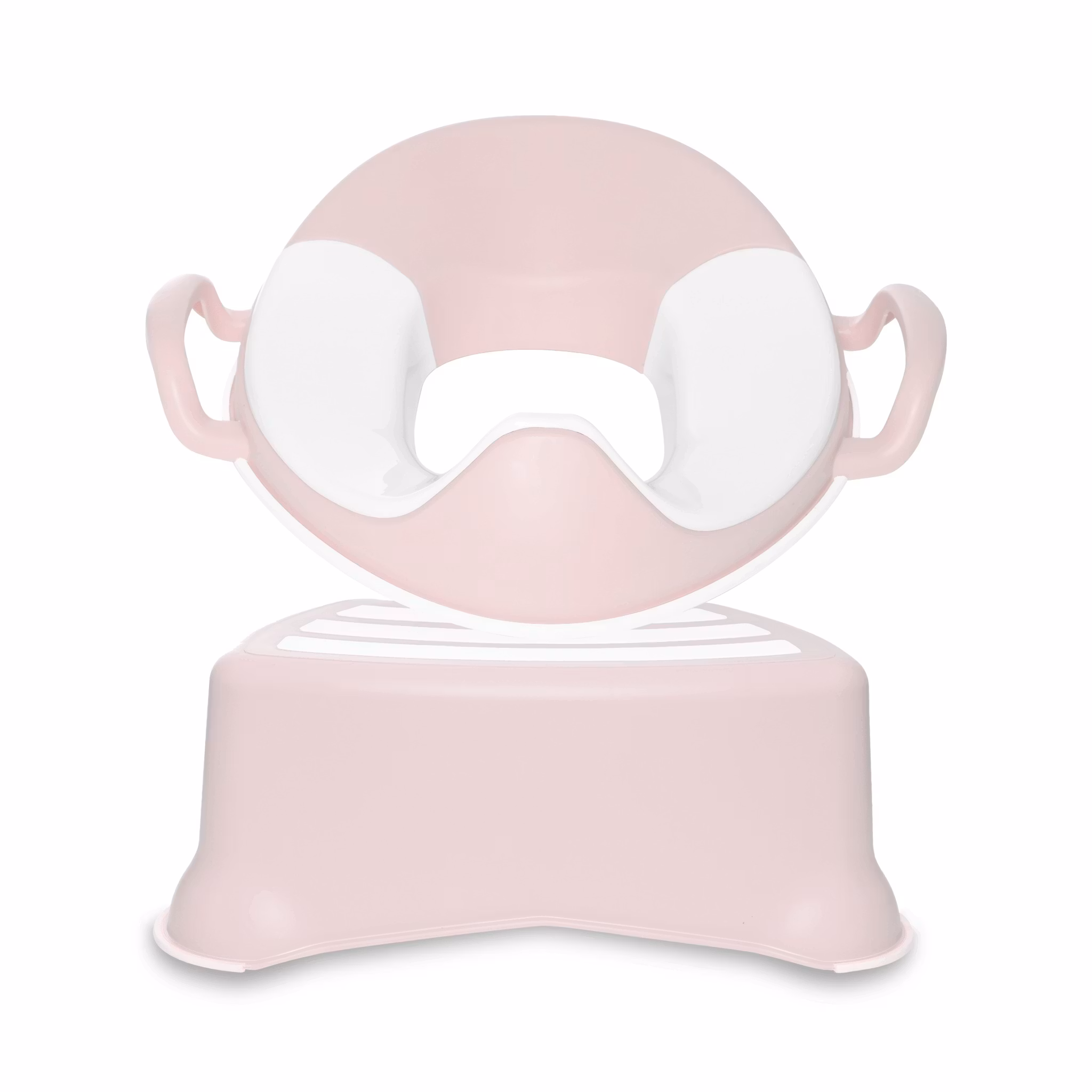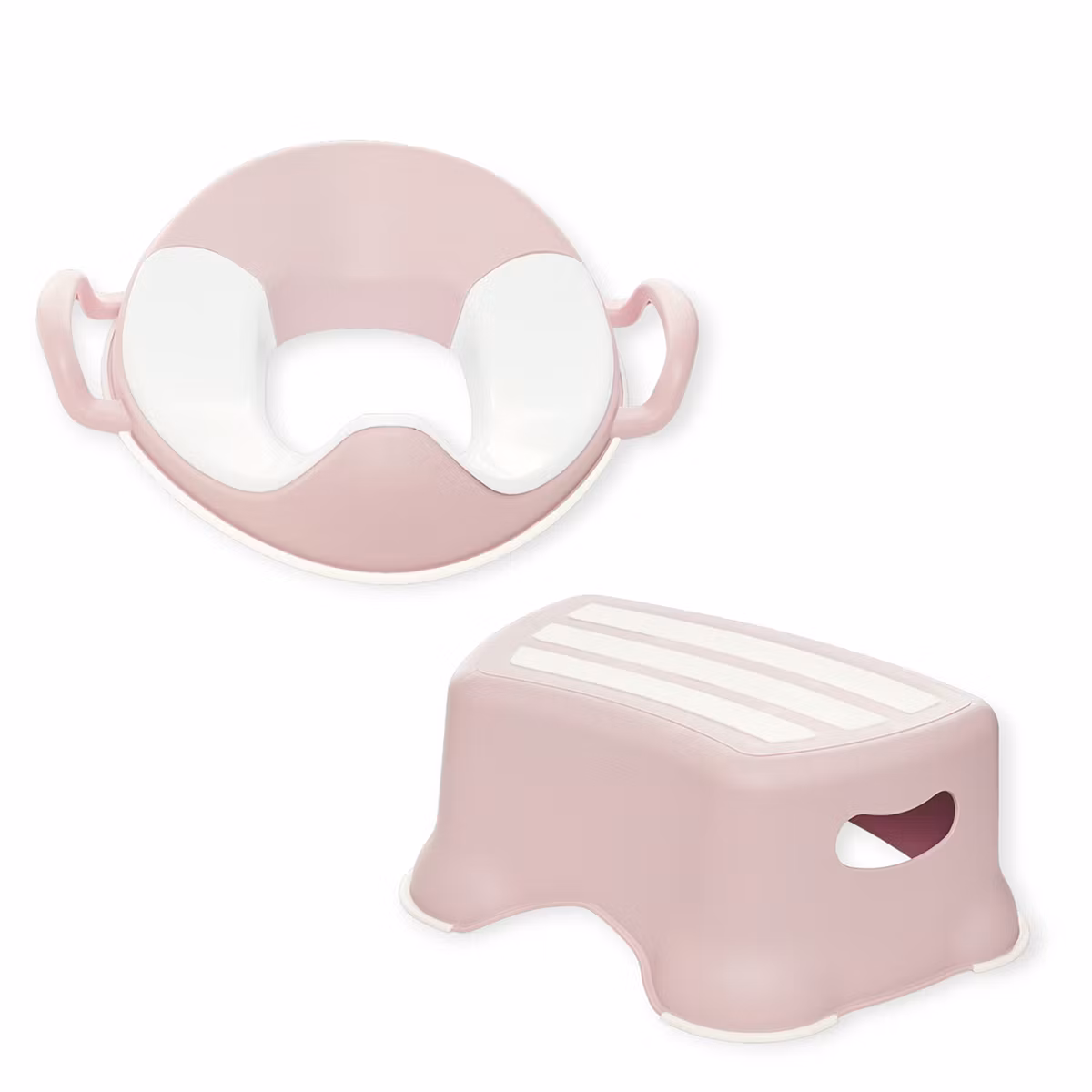Her et sæt med matchende toiletsæde og skammel, der passer perfekt, når barnet begynder at bruge det almindelige toilet.