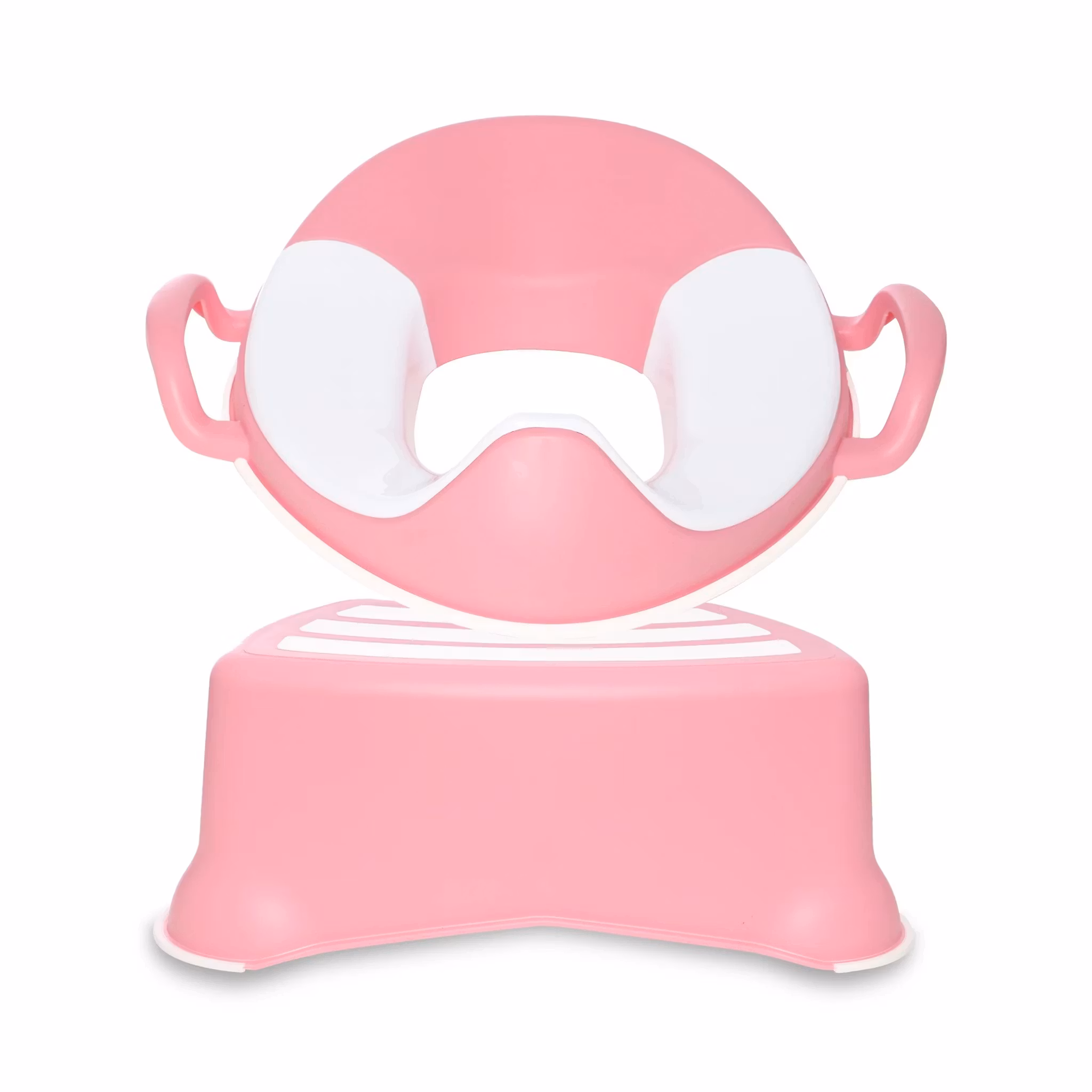 Her et sæt med matchende toiletsæde og skammel, der passer perfekt, når barnet begynder at bruge det almindelige toilet.
