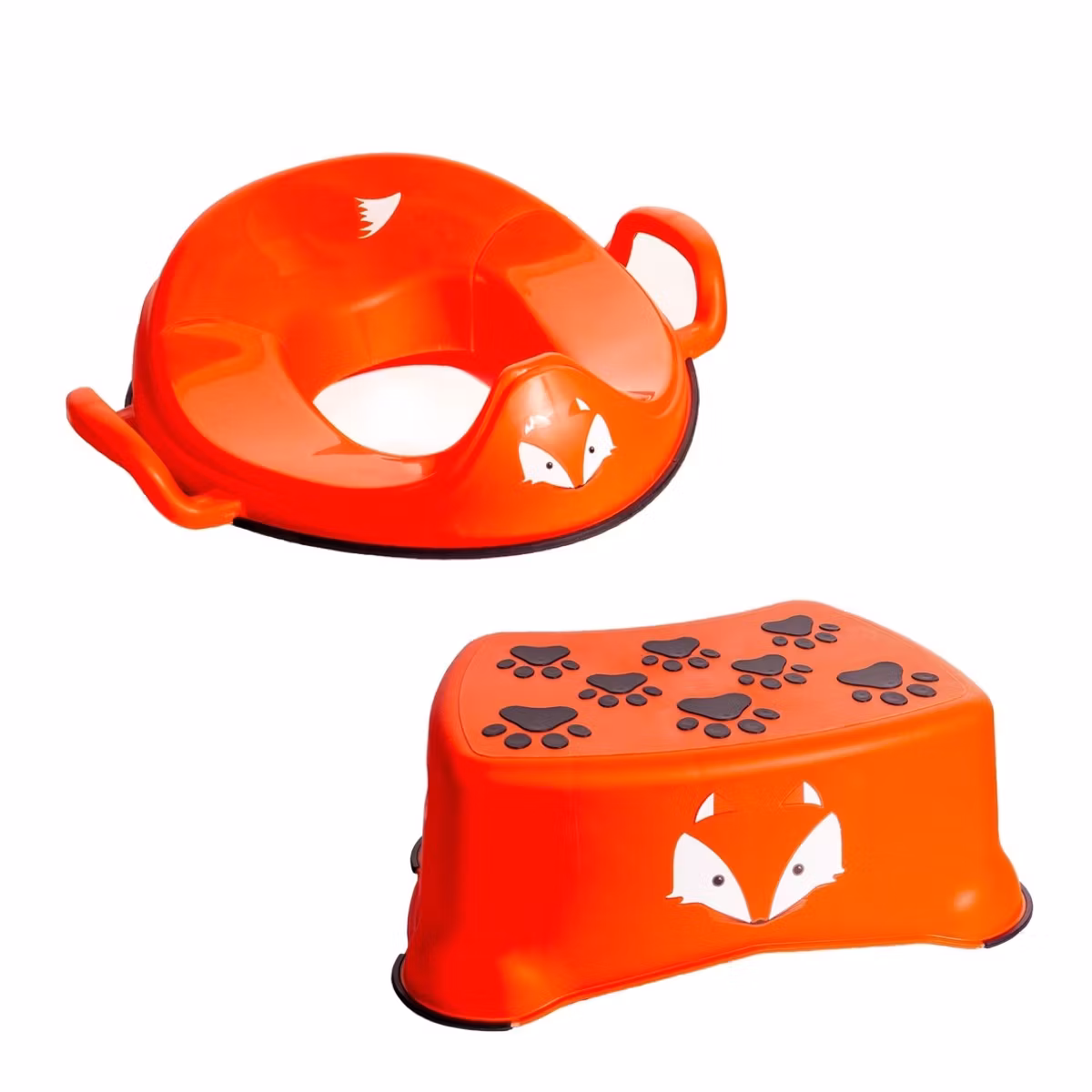Her et sæt med matchende toiletsæde og skammel, der passer perfekt, når barnet begynder at bruge det almindelige toilet.